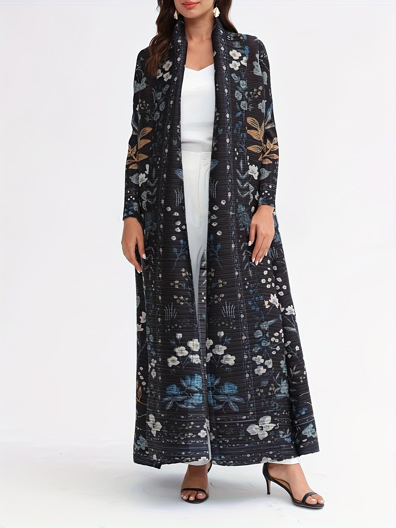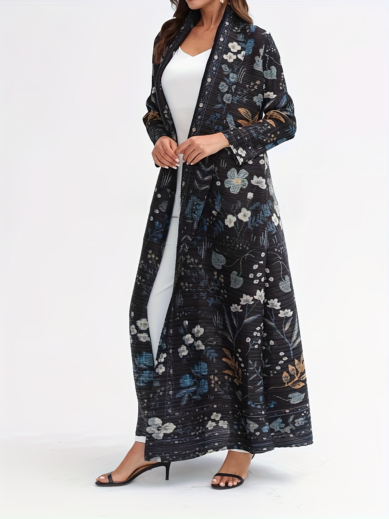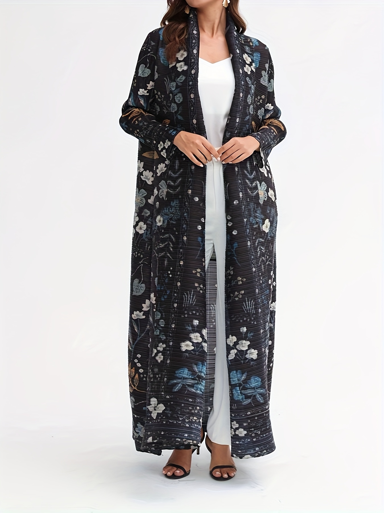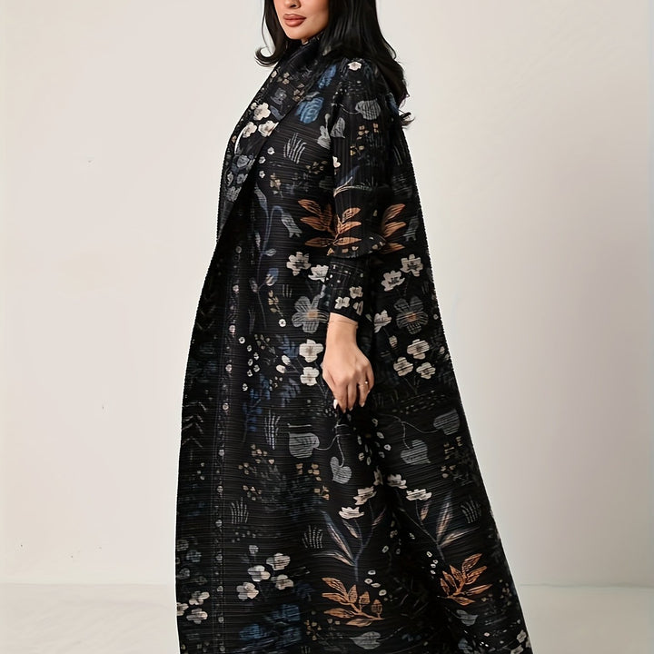 Issey Miyake-Inspired Floral Print Abaya Coat - High-Stretch Long Flowy Muslim Dress with Adjustable Waistband, Plus Size A-Line Silhouette, Machine Washable Ramadan Eid Clothing for Women, Four Seasons Versatile Middle Easte